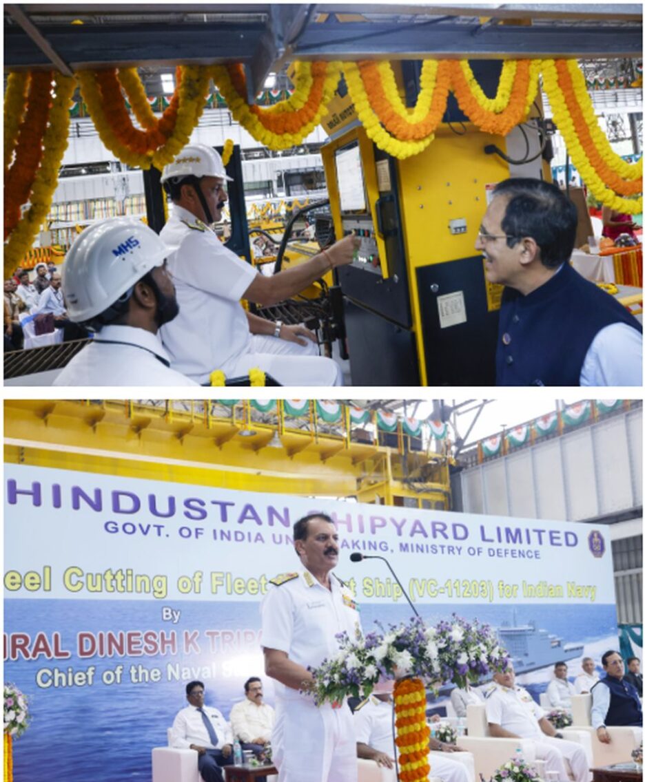 Steel Cutting’ ceremony of fourth of the five Fleet Support Ships (FSS) was held at Hindustan Shipyard Limited (HSL) on 19 Jun 2025, in presence of Adm Dinesh K Tripathi, Chief of the Naval Staff as the Chief Guest. VAdm Rajesh Pendharkar, Flag Officer Commanding-in-Chief, Eastern Naval Command, VAdm Rajaram Swaminathan, CWP&A, Cmde Hemant Khatri CMD HSL, and other senior officials from Indian Navy and HSL were present for the occasion.